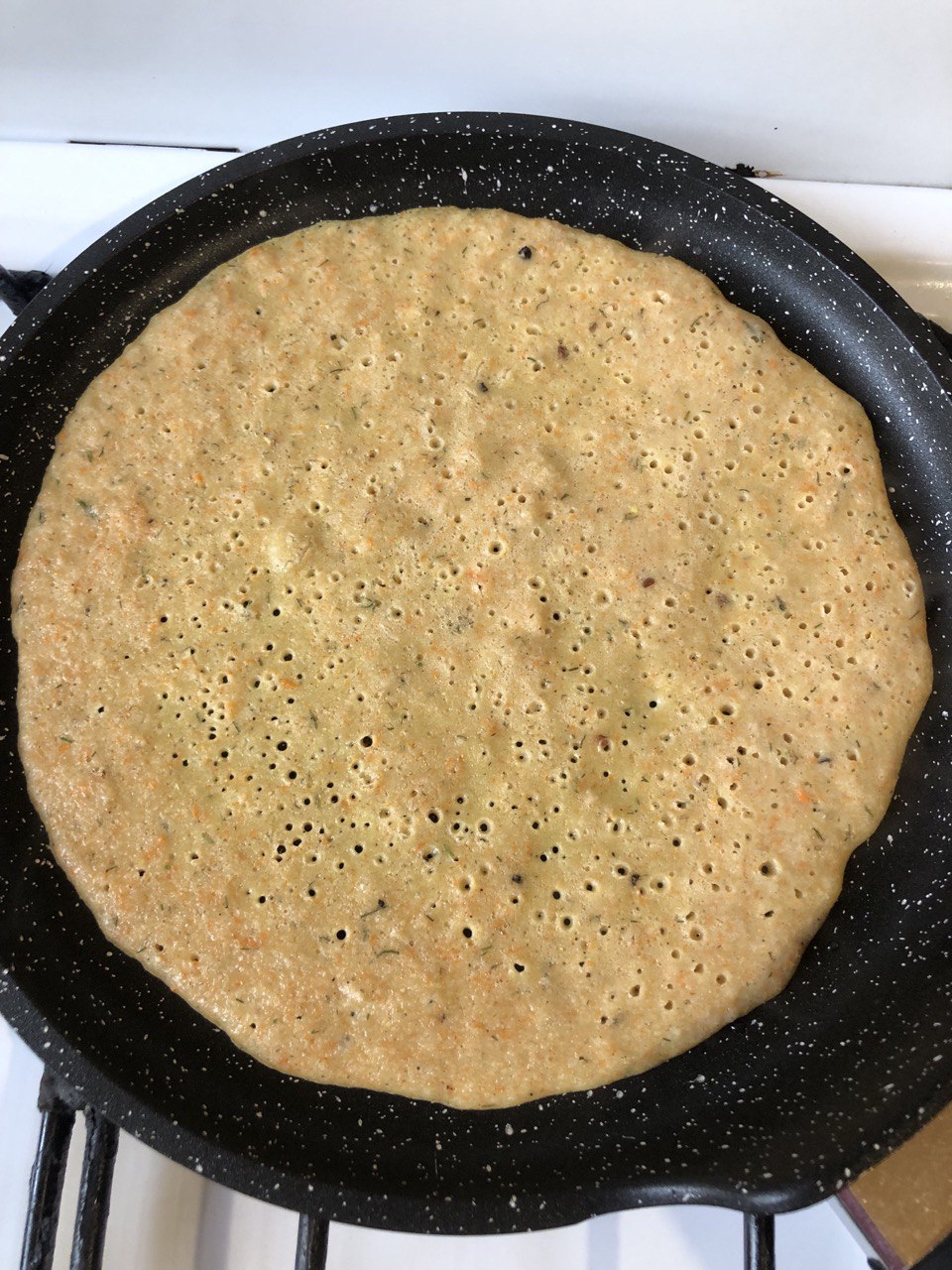 Надыбала в Youtube интересный рецепт – блины со вкусом чебуреков)). В привычное блинное тесто добавляем измельчённый сырой репчатый лук. Я, немного подумав, закинула туда ещё и тёртую морковь. Всё смешала в блендере, добавила яйцо и специи. Дала тесту настояться в холодильнике. Когда достала его, на вкус оно было немного горьким, что меня смутило. Тем не менее решила сразу же нажарить блинов.
